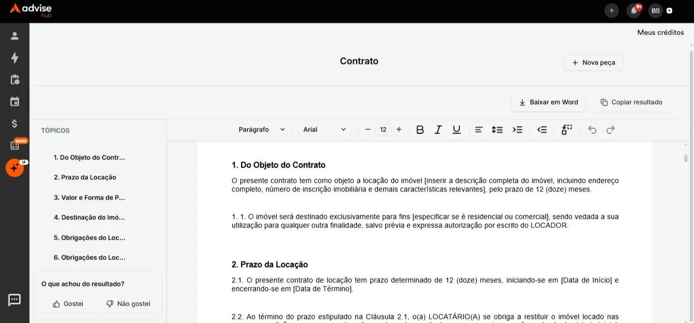 A partir dessas informações, a IAdvise estrutura o contrato com base na legislação brasileira vigente e na prática jurídica adequada ao caso.