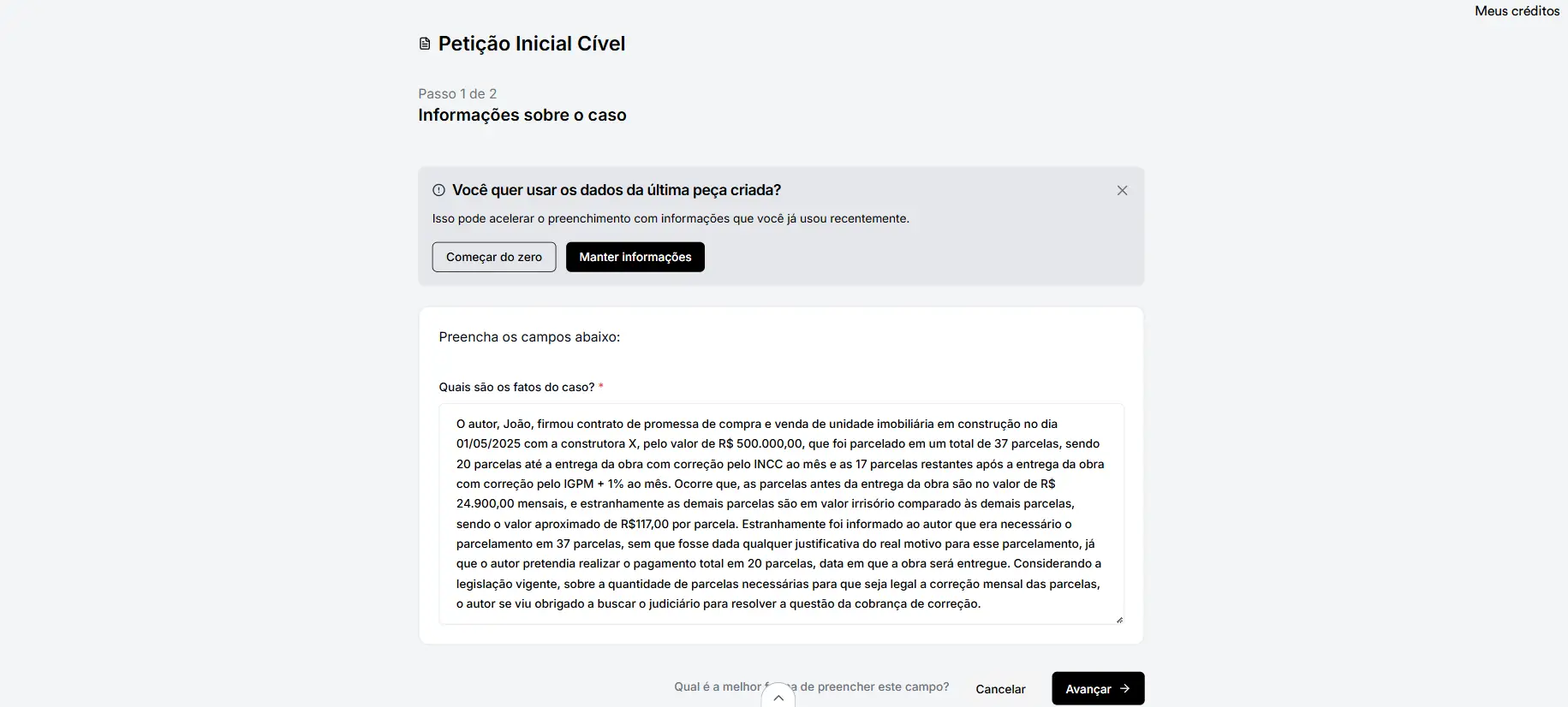 O advogado insere as informações necessárias conforme o tipo de peça jurídica. Isso pode incluir a descrição dos fatos, dados das partes, valores, datas, documentos relevantes ou decisões já proferidas no processo. Em peças recursais, como apelações, é possível anexar a sentença para que a IAdvise identifique automaticamente os pontos centrais da decisão.